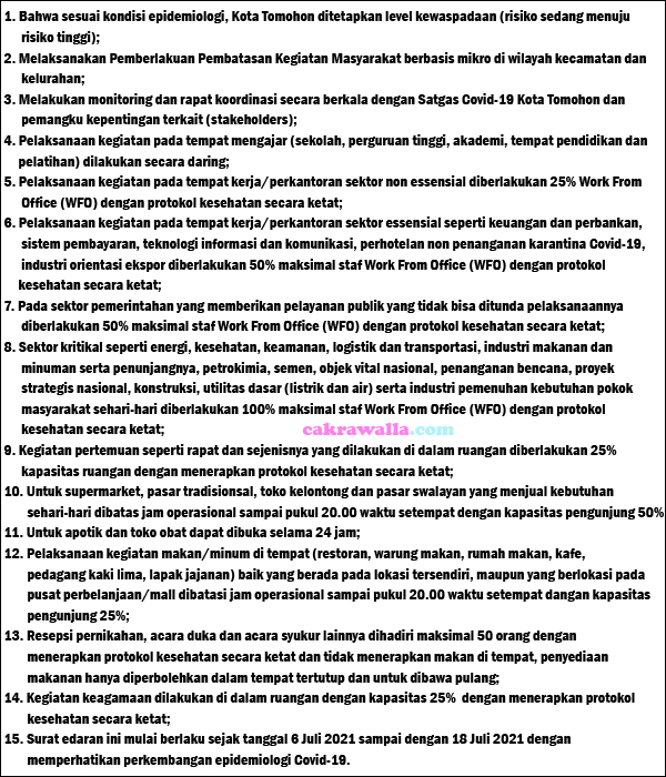 CAKRAWALLA – Wali Kota Tomohon Caroll Senduk SH mengeluarkan Surat Edaran Nomor: 296/WKT/VII-2021 Tentang Antisipasi Peningkatan Kasus Covid-19 Di Kota Tomohon.